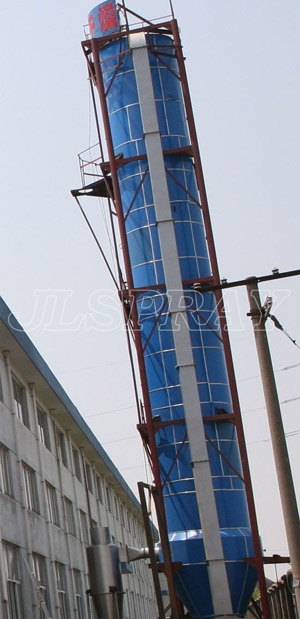 Ambient air enter into air condenser,The fine mist (the size of the mist can be controled) contact with the cooling air , complete the instant drying,and they Continuous cooling in the proces of drop down。Cooled materials discharge from the drying tower and the cyclone deduster,exhaust gas be discharged by suction blower.